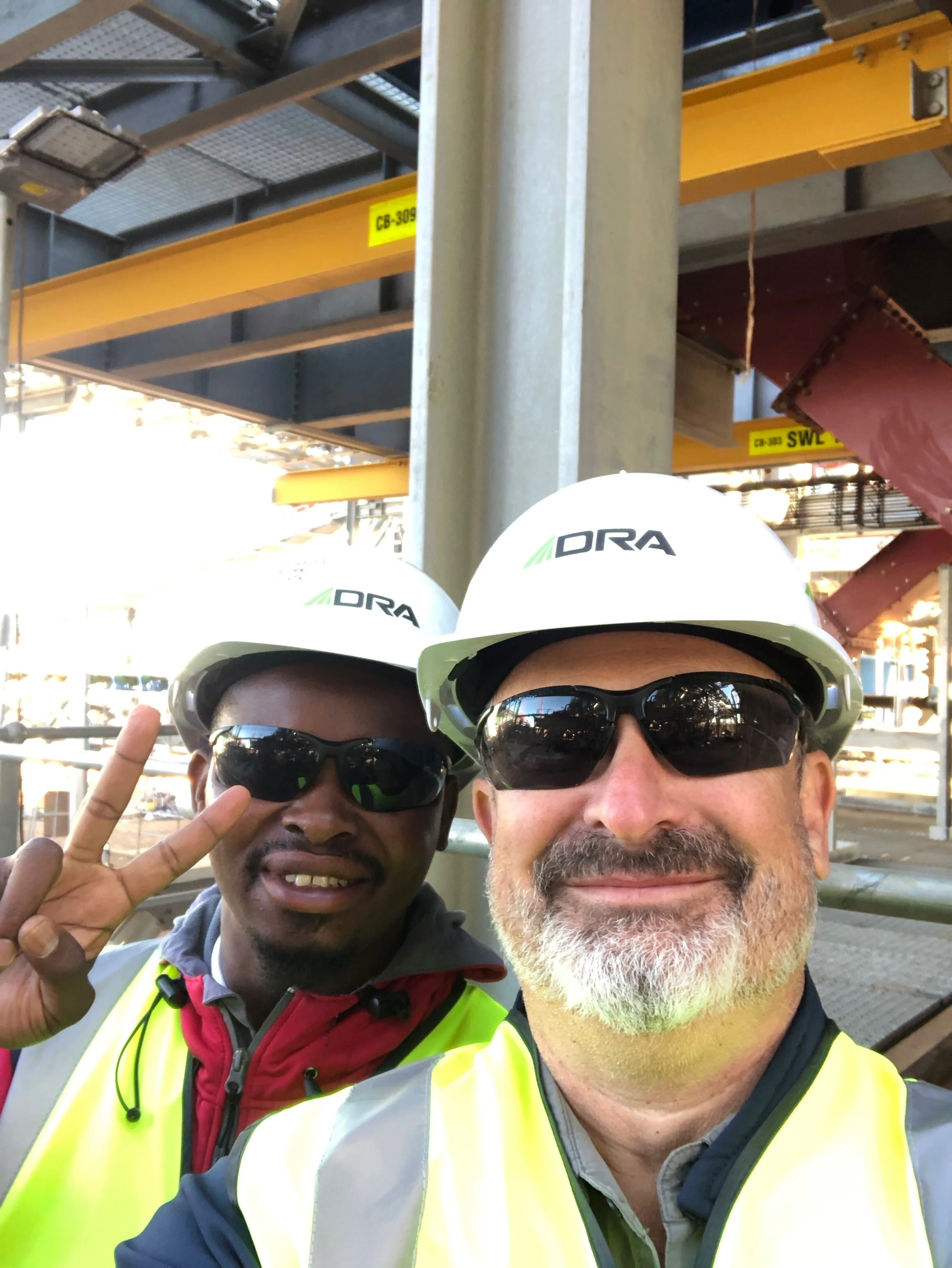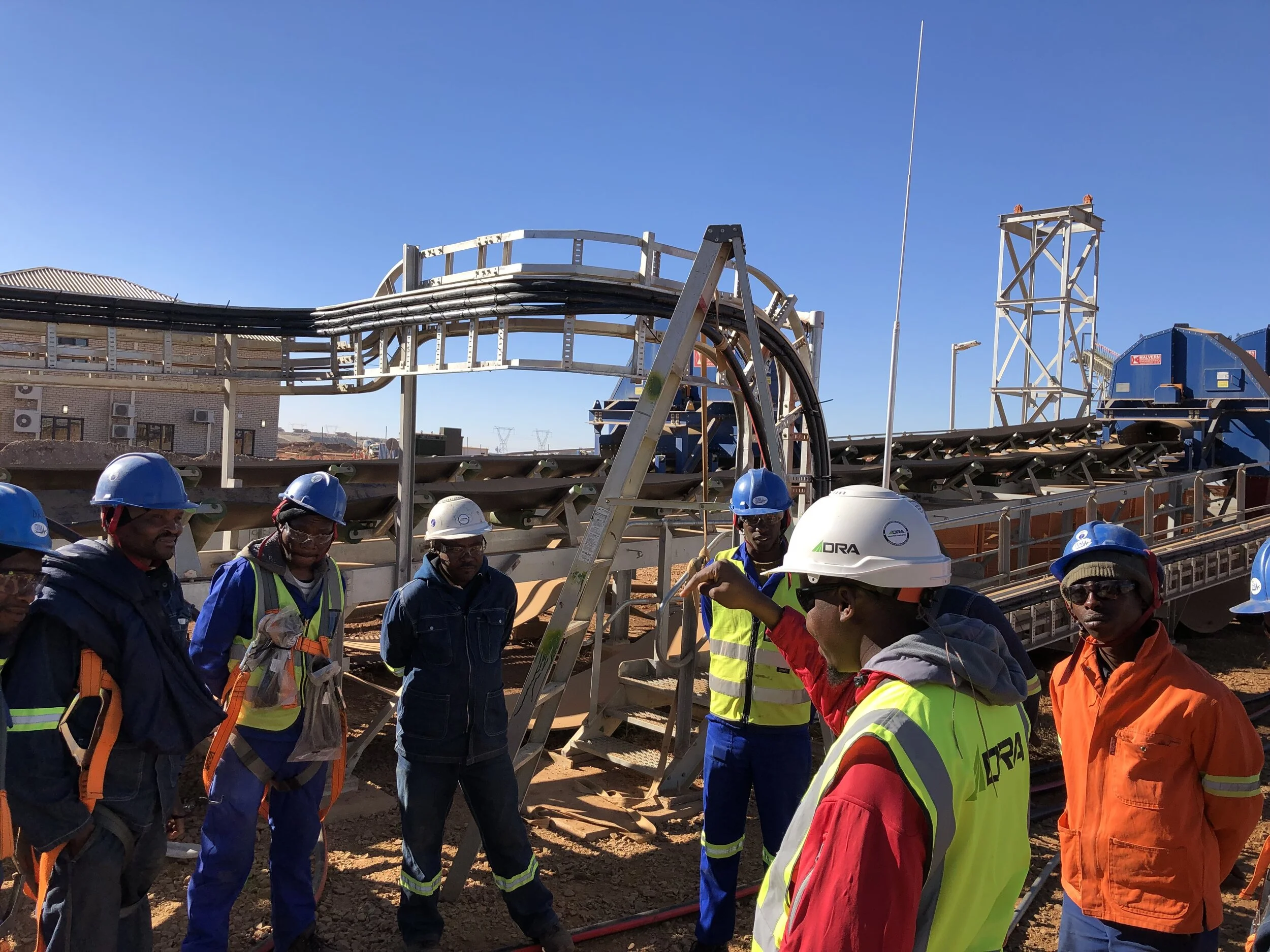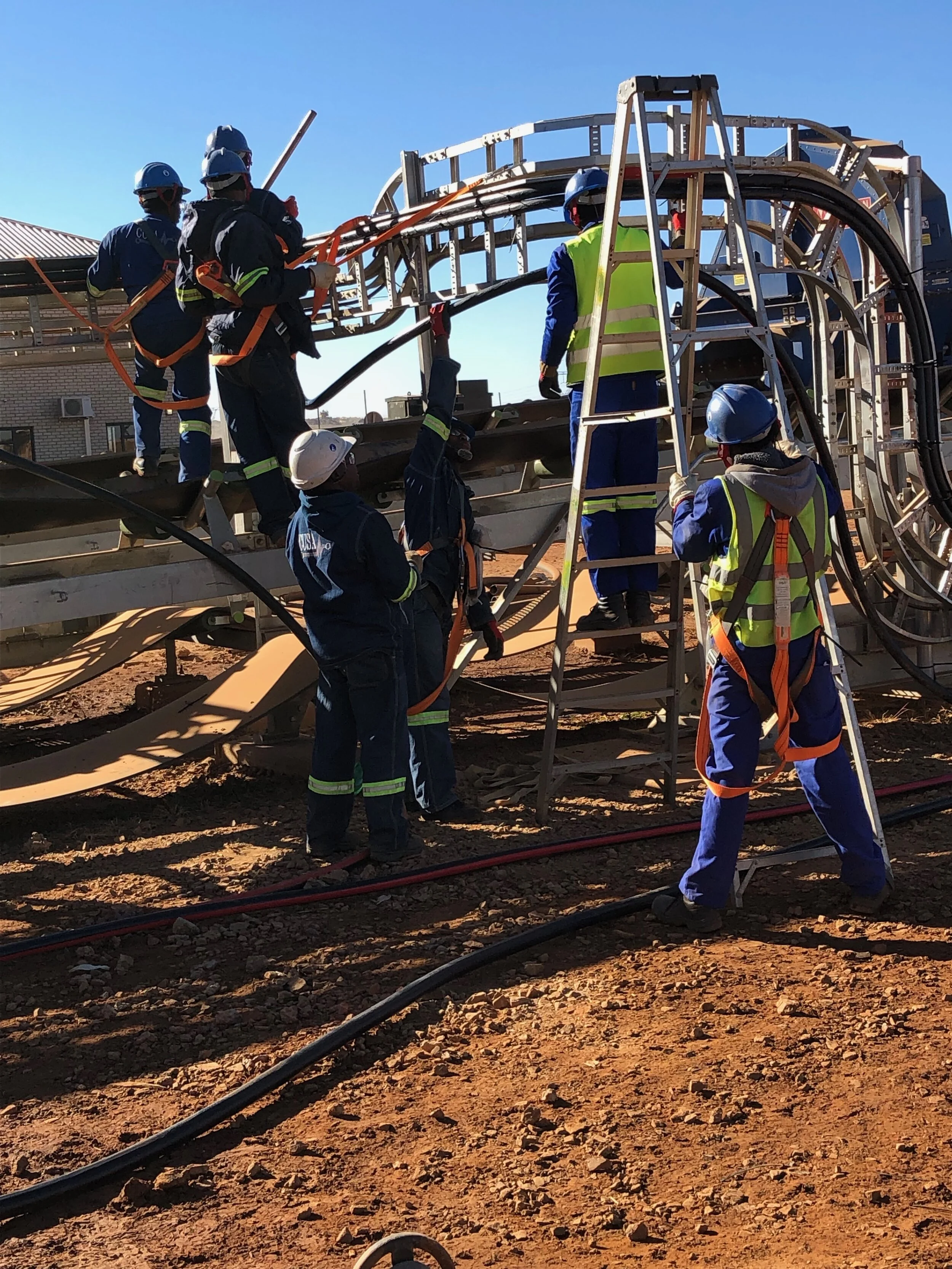 It became apparent that they had no real experience with fall protection. They knew to clip in but three of them did it on the conveyer at their feet. Sam and I stayed quiet as they continued to chat amongst themselves, pointing at various points of the conveyer assembly and the harness. Eventually they all clipped onto the conveyer assembly at eye height but quickly discovered their straps were in the way of the cable bundles. Eventually, they clipped in at the top of the assembly and proceeded to successfully, and safely, wrestle the cables into place and tie them in.